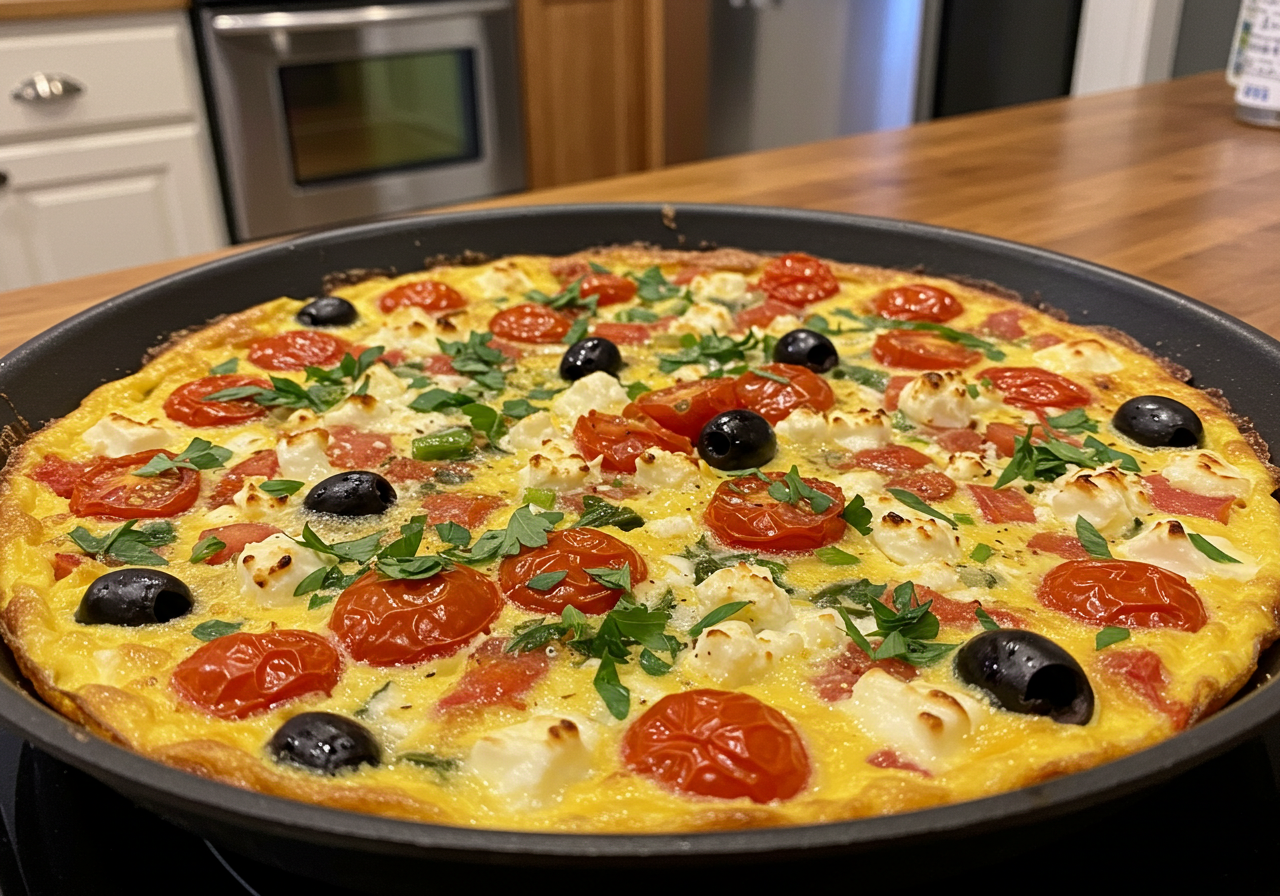 将蛋液倒入锅中,铺上番茄丁和菲达奶酪